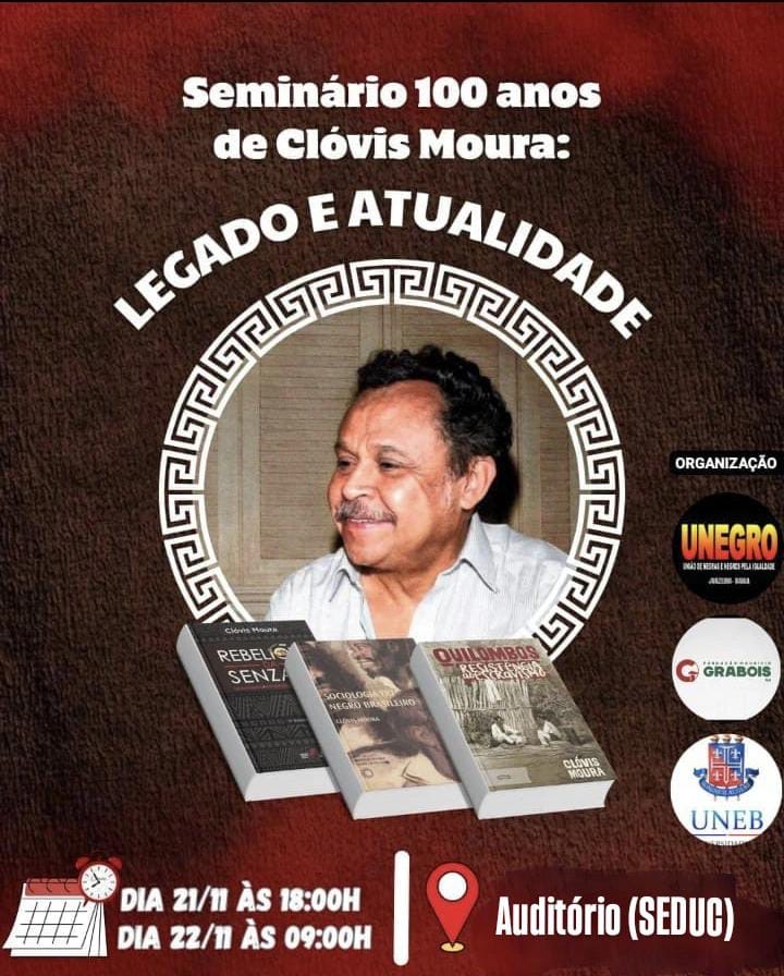 O Seminário 100 anos de Clóvis Moura: Legado e Atualidade chega a Juazeiro, no norte da Bahia, nesta sexta-feira (21) e sábado (22), reunindo estudantes, militante do movimento negro, docentes e pesquisadores de diversas universidades para celebrar o centenário de um dos principais intelectuais brasileiros na análise da formação social, da luta negra e das resistências quilombolas. O evento será realizado no auditório da SEDUC.