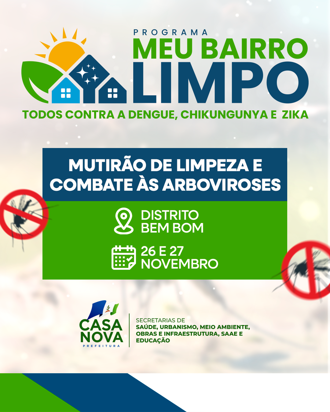 Nesta quarta e quinta-feira, dias 26 e 27 de novembro, a comunidade de Bem Bom, interior de Casa Nova, será contemplada com mais uma etapa do programa “Meu Bairro Limpo”. A iniciativa da Prefeitura reúne diversas secretarias em um grande mutirão para transformar o ambiente urbano, reforçar a limpeza pública e intensificar o combate às arboviroses.