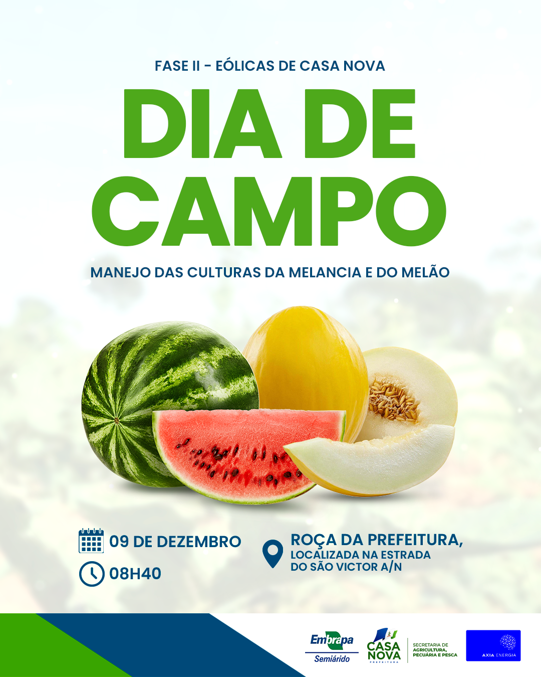 A Prefeitura de Casa Nova, por meio da Secretaria de Agricultura, Pecuária e Pesca, realiza mais uma importante ação voltada ao fortalecimento do campo e ao avanço da produção local. Em parceria com a Embrapa Semiárido e a Axia Energia, será promovido nesta terça-feira (9), um Dia de Campo especialmente dedicado ao manejo do melão e da melancia.