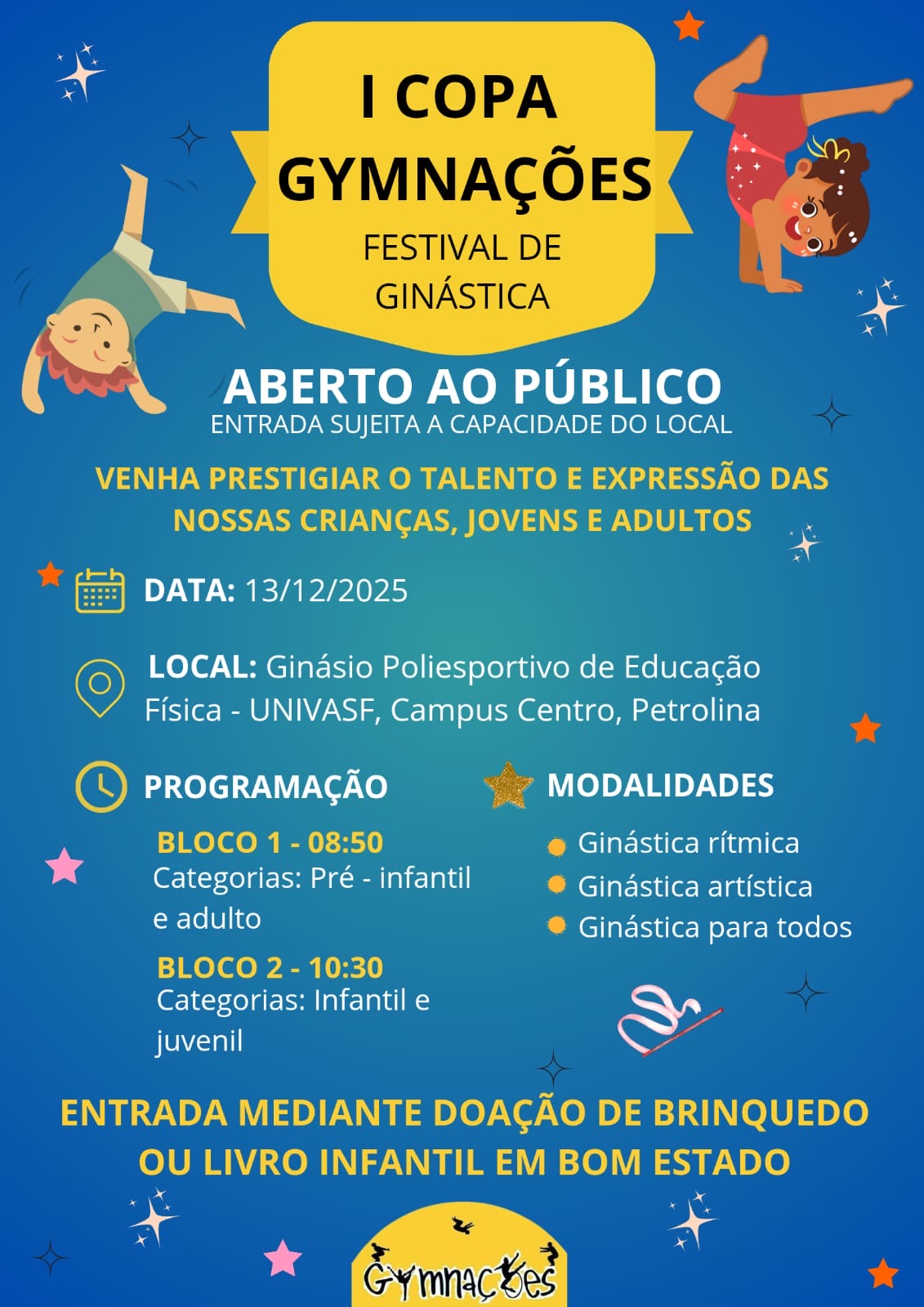 A I Copa Gymnações – Festival de Ginástica será realizada em Petrolina, no Sertão de Pernambuco, no próximo sábado (13), no Ginásio Poliesportivo da Univasf, no Campus Centro. O evento, promovido pelo Colegiado de Educação Física, reúne apresentações de Ginástica Artística, Ginástica Rítmica e Ginástica Para Todos.
