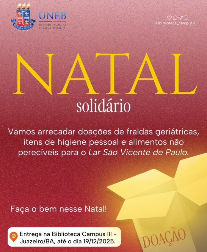 A Biblioteca da UNEB, campus III, em Juazeiro, está realizando até o dia 19 de dezembro a campanha “Natal Solidário”, com arrecadação de alimentos não perecíveis, produtos de higiene e fraldas geriátricas, em prol do Lar São Vicente de Paulo, em Juazeiro.