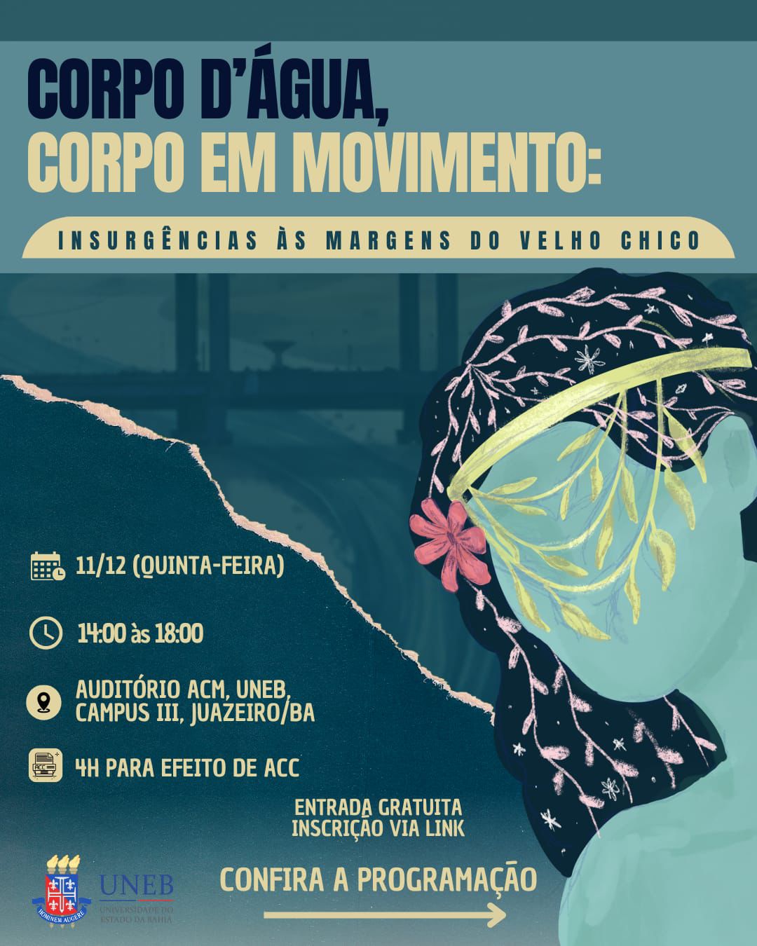 Estudantes do 7º período do curso de Direito, da Uneb em Juazeiro, realizam nesta quinta-feira (11), a partir das 14h, no Auditório Antônio Carlos Magalhães, o evento “Corpo d’Água, Corpo em Movimento: Insurgências às margens do Velho Chico”. O evento é dedicado a diálogos sobre o corpo, território e resistência sob o olhar do direito.