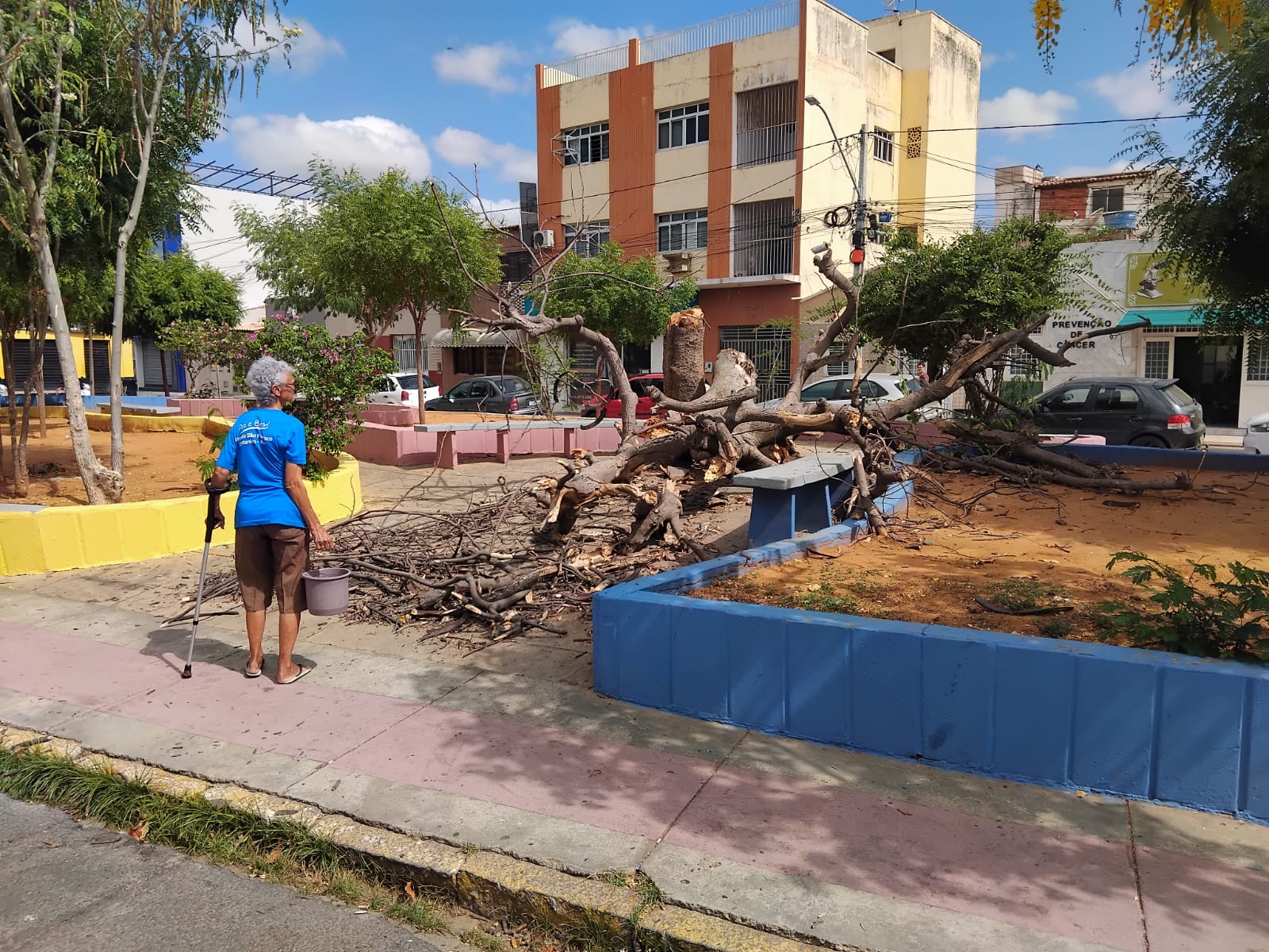 “Caiu mais uma árvore aqui na Praça do Boi desde ontem, não sei como não pegou um bocado de gente”, relatou o morador.
