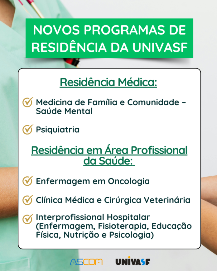 A Universidade Federal do Vale do São Francisco (Univasf) implantará cinco novos Programas de Residência Médica e Residência em Área Profissional da Saúde a partir de 2026. Serão criadas as Residências Médicas em Psiquiatria e em Medicina de Família e Comunidade – Saúde Mental. Já as novas Residências em Área Profissional da Saúde a serem implantadas são Enfermagem em Oncologia, Interprofissional Hospitalar e Clínica Médica e Cirúrgica Veterinária. As novas residências terão ingresso da primeira turma em março de 2026, com exceção do Programa de Clínica Médica e Cirúrgica Veterinária, cujo início será em 2027.