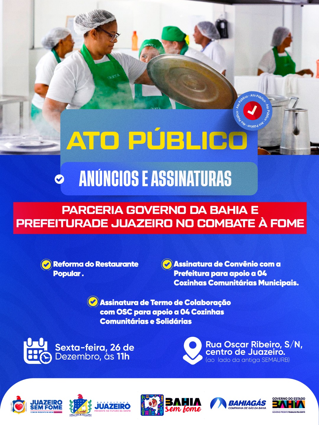 O evento será realizado às 11h, na Rua Oscar Ribeiro, s/n, no centro de Juazeiro, ao lado da antiga SEMAURB, e é aberto ao público. A ação integra as estratégias de gestão municipal para ampliar o acesso à alimentação adequada, fortalecer a rede de proteção social e garantir mais dignidade às famílias em situação de vulnerabilidade social.