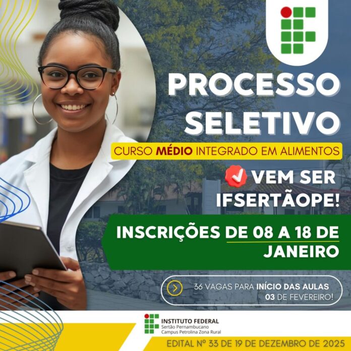 O campus Petrolina Zona Rural do IFSertãoPE divulgou, nesta terça-feira (6), o edital nº 33/2025, referente ao processo seletivo para ingresso no curso Médio Integrado ao Técnico em Alimentos. São ofertadas 36 vagas. Podem concorrer estudantes que concluíram ou estão terminando o 9º ano do Ensino Fundamental ou série equivalente.