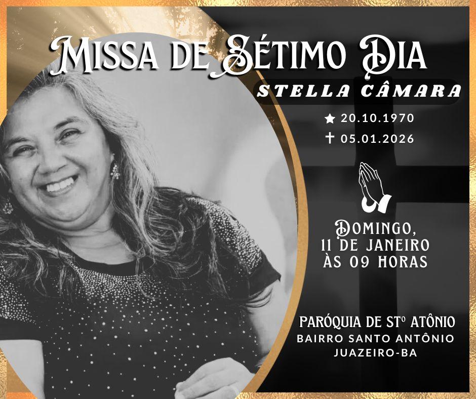 Acontece no próximo domingo (11), às 9 horas, na Paróquia de Santo Antônio, em Juazeiro, a Missa de Sétimo Dia da cantora Stella Câmara.