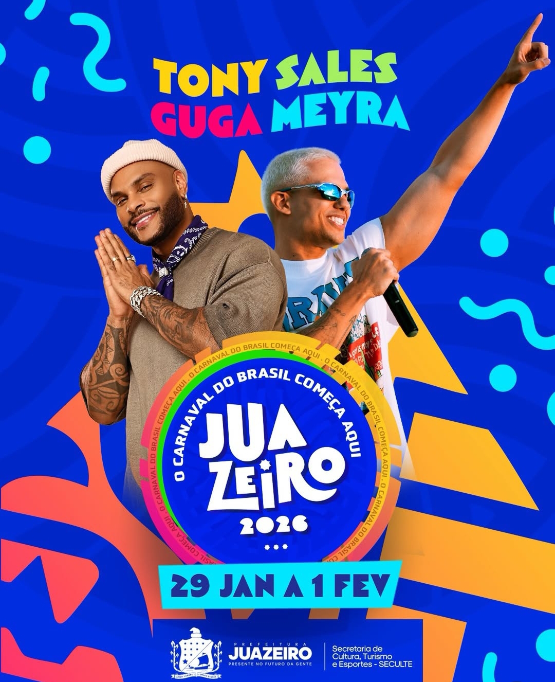 A Prefeitura de Juazeiro, na região Norte da Bahia, anunciou nesta sexta-feira (09), por meio das redes sociais, mais duas atrações que vão integrar a programação do Carnaval de Juazeiro 2026. Os artistas Tony Salles e Guga Meyra foram confirmados e passam a reforçar a grade da festa, que acontece entre os dias 29 de janeiro e 1º de fevereiro.