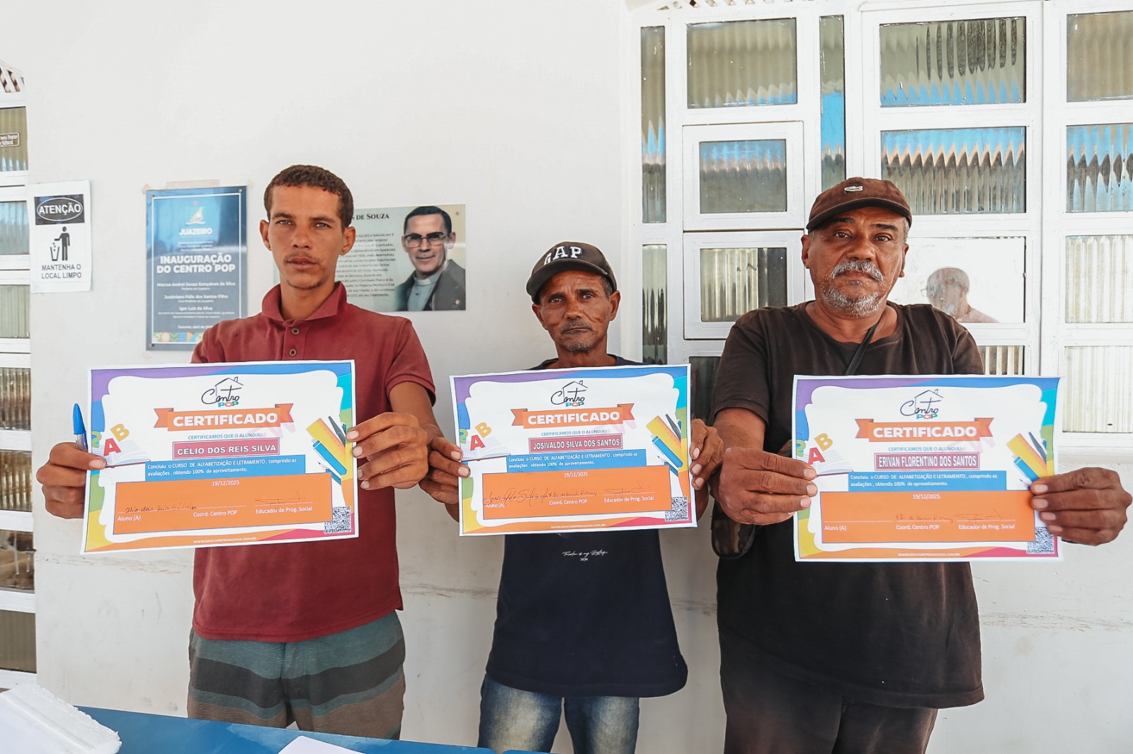 De acordo com Trajano Lino, o certificado representa mais que um documento formal. “Os que mais frequentam é que recebem um certificado de alfabetização. Em seis meses, a gente dá o direito de entregar o a cada um deles. Eu coloco nesse certificado um ajuste maior para que eles possam trabalhar mais ainda no letramento”, explica o educador social.