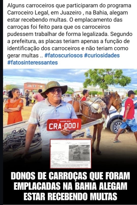 Publicações que circulam nas redes sociais têm causado apreensão entre carroceiros em Juazeiro, no norte da Bahia, ao sugerirem que trabalhadores cadastrados no programa Carroceiro Legal estariam sendo multados após o emplacamento das carroças. A informação, no entanto, não é verdadeira e trata-se de fake news.