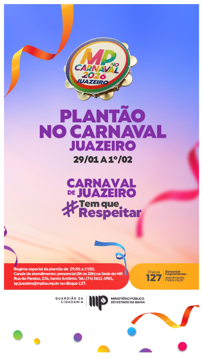O Ministério Público da Bahia estará de plantão, em regime de 24 horas, durante o Carnaval de Juazeiro, que acontece de29 de janeiro e 1º de fevereiro.