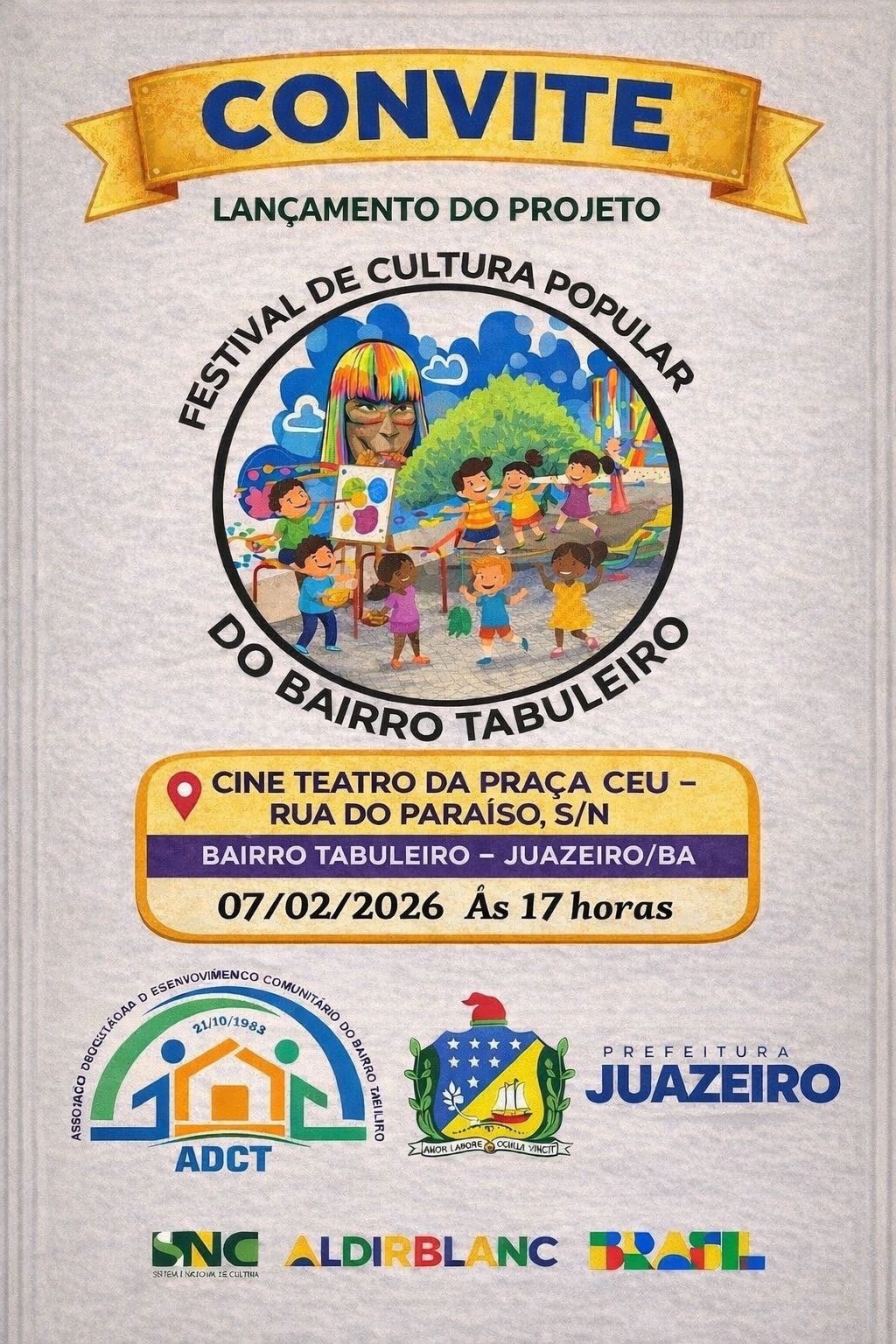 A comunidade do bairro Tabuleiro, em Juazeiro, no norte da Bahia, receberá neste sábado, 7 de fevereiro de 2026, às 17h, o lançamento oficial do Festival de Cultura Popular do Bairro Tabuleiro, iniciativa que celebra a cultura local, fortalece a participação comunitária e amplia o acesso gratuito às artes.