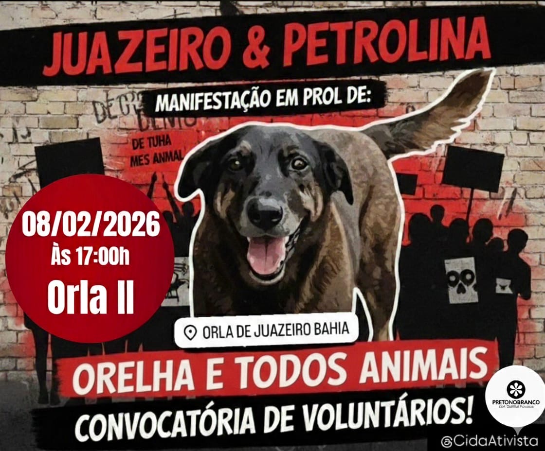 Uma manifestação em prol do cão Orelha e de todos os animais vítimas de maus-tratos será realizada neste domingo (8), a partir das 17h, na Orla II de Juazeiro, no norte da Bahia. O ato é convocado por protetores independentes e pelo projeto Salvando Patas do Vale, que atua na causa animal na região do Vale do São Francisco.