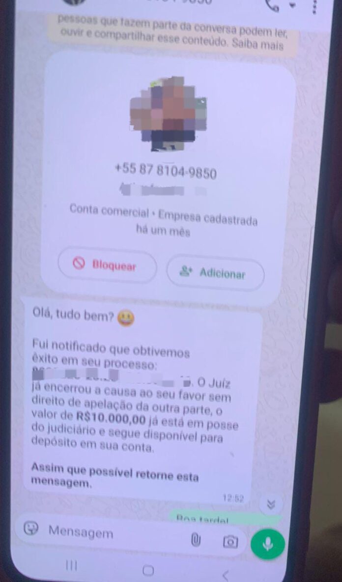 Conforme o relato, a mulher recebeu mensagens via WhatsApp de um número desconhecido, no qual o interlocutor se apresentava como advogado e informava sobre uma suposta decisão judicial favorável, com liberação de valores em torno de R$ 10 mil. Para dar credibilidade à conversa, o golpista utilizou foto, nome e dados de um advogado regularmente inscrito na OAB de Petrolina, além de encaminhar um arquivo em PDF com aparência de petição judicial.
