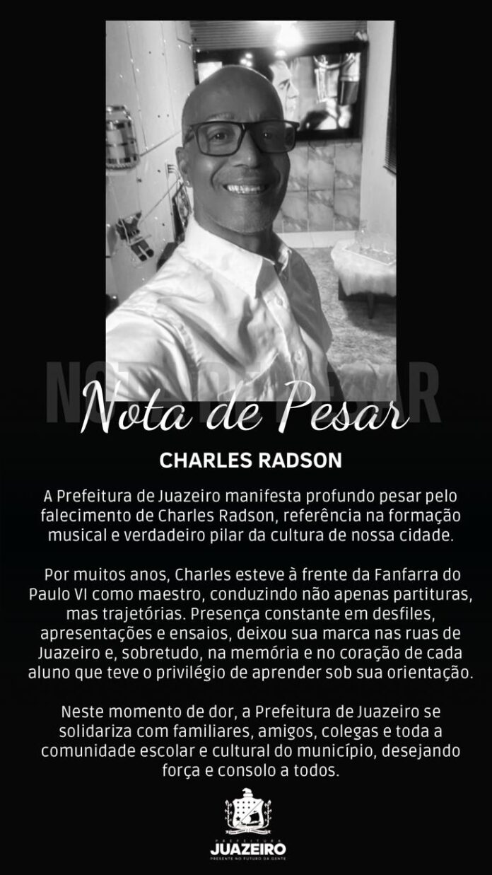 A Prefeitura de Juazeiro, por meio da Secretaria de Cultura, Turismo e Esportes (Seculte), manifesta profundo pesar pelo falecimento de Charles Radson, reconhecido como uma das grandes referências da fanfarra do Colégio Paulo VI, deixando um legado marcante na cultura e na memória afetiva de Juazeiro.