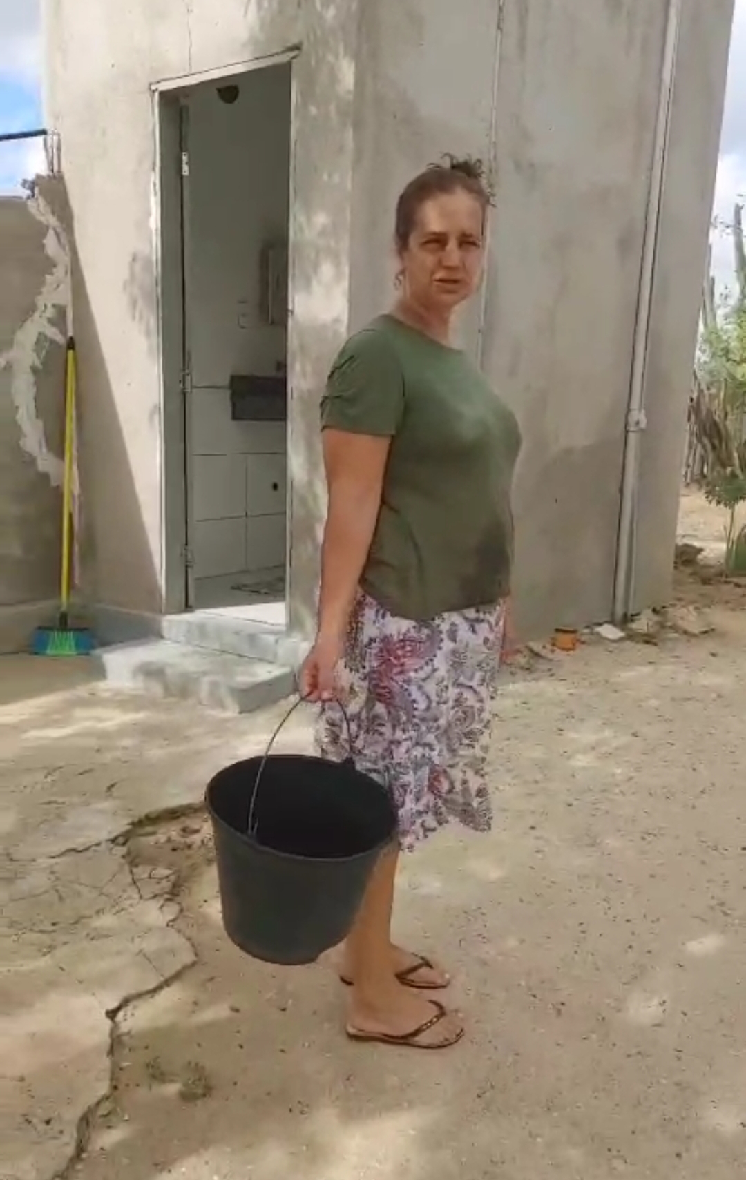 Diante da escassez, a moradora diz que tem recorrido ao pouco que consegue. “A sorte foi que deu uma chuvinha e a gente conseguiu pegar um pouco de água da chuva, senão era pior ainda. A gente está tomando banho um dia sim, outro não. É um balde de água só para conseguir dormir. Num calor desse, não ter nem água para um banho é muito sofrimento”, conta.