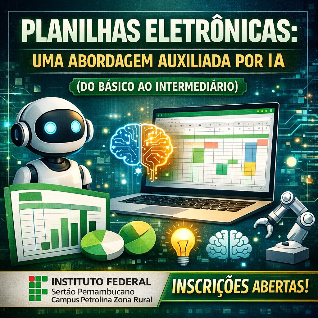 Já o curso “Planilhas eletrônicas: Uma abordagem auxiliada por IA (do Básico ao Intermediário)” tem como objetivo capacitar o estudante a criar, interpretar e automatizar planilhas eletrônicas, utilizando IA como ferramenta de apoio, mantendo pensamento crítico, domínio conceitual e autonomia técnica. Também estão disponíveis 36 vagas. As aulas serão presenciais e acontecerão no Laboratório de Informática do campus Petrolina Zona Rural, todas as quartas-feiras, a partir do dia 11 de março, das 10h às 12h e das 13h às 15h.