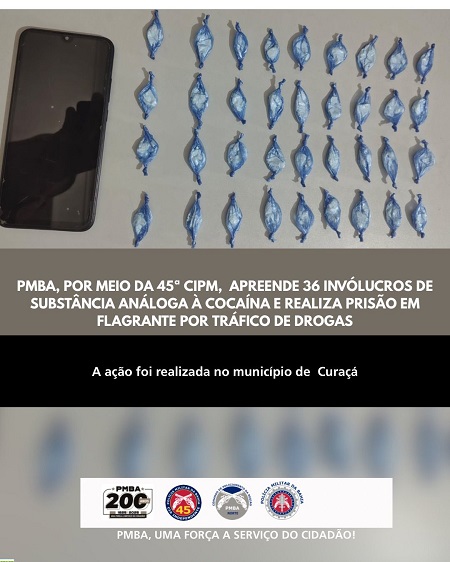 Equipes da 45ª Companhia Independente de Polícia Militar (CIPM/Curaçá) realizaram, neste sábado (21), a apreensão de 36 invólucros de cocaína e efetuou prisão em flagrante por tráfico de drogas no município de Curaçá.
