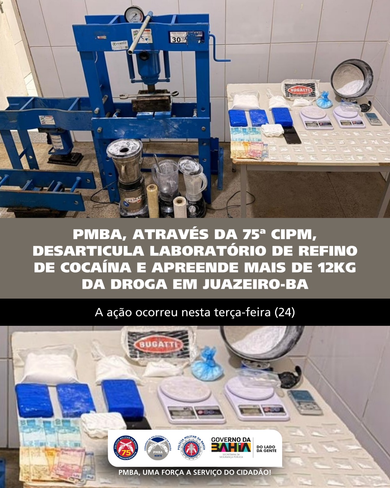 Uma ação da Polícia Militar da Bahia resultou na desarticulação de um laboratório de refino de cocaína no município de Juazeiro, na Norte do estado. A operação aconteceu na tarde desta terça-feira (24), por volta das 17h, no Residencial Dr. Humberto.
