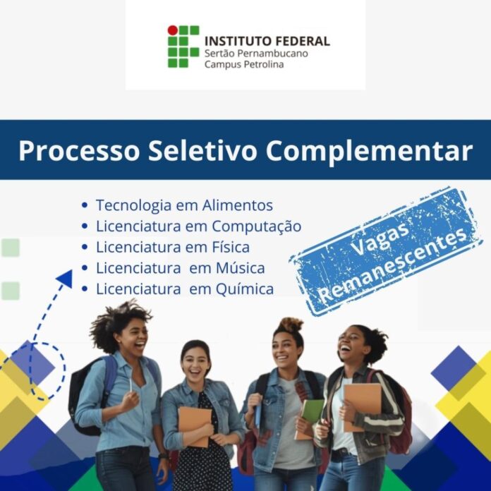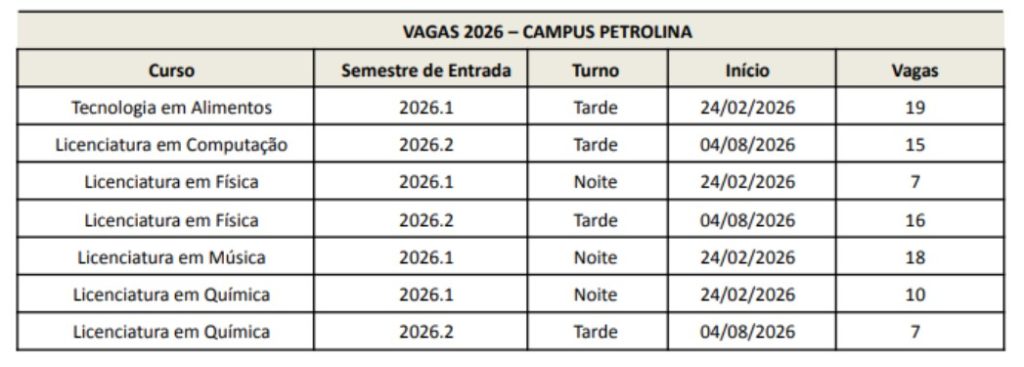 O campus Petrolina do Instituto Federal do Sertão Pernambucano (IFSertãoPE) informa que, no período de 27 de fevereiro a 8 de março de 2026, estão abertas as inscrições para o preenchimento de vagas remanescentes nos cursos superiores de Tecnologia em Alimentos e nas Licenciaturas em Computação, Física, Música e Química, com ingresso no primeiro e segundo semestres de 2026. Para concorrer às vagas disponíveis, os candidatos deverão preencher o formulário eletrônico disponível no portal da instituição, desde que tenham participado de qualquer edição do Exame Nacional do Ensino Médio (Enem).
