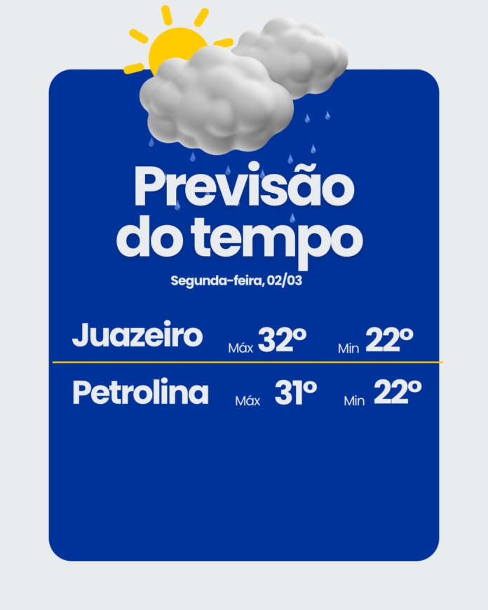 A semana começa com tempo instável em Juazeiro, no norte da Bahia, e Petrolina, no sertão de Pernambuco. A previsão para esta segunda-feira (2) indica muitas nuvens ao longo de todo o dia, com pancadas de chuva, inclusive com a possibilidade de trovoadas à noite nas cidades irmãs.