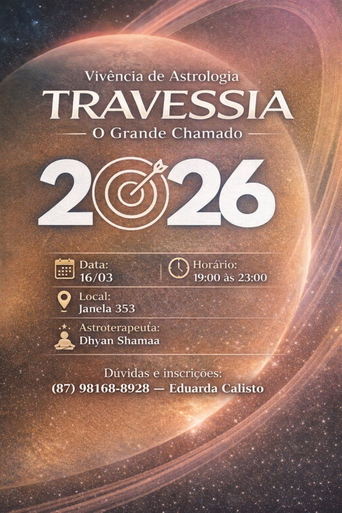 Para iniciar 2026, será realizada no dia 16 de março, no espaço Janela 353, em Petrolina-PE, pela 1ª vez, a vivência “Travessia – O Grande Chamado”, guiada pela astroterapeuta Dhyan Shamaa, pernambucana que atualmente mora em Brasília. A experiência é indicada para quem deseja compreender a astrologia de forma estruturada e aplicável, utilizando o conhecimento como ferramenta de autoconhecimento e planejamento pessoal.