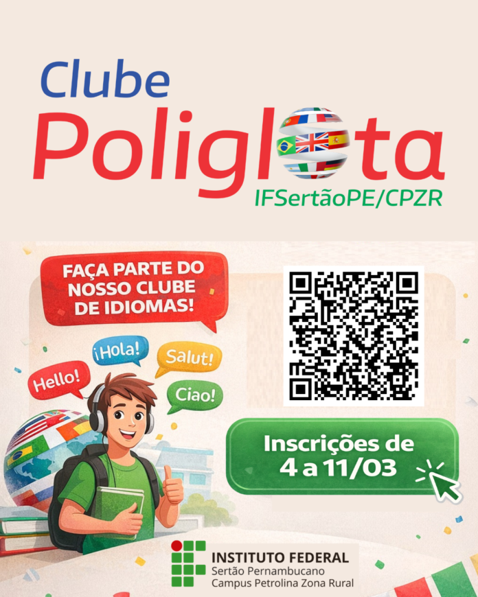 O campus Petrolina Zona Rural do IFSertãoPE está com inscrições abertas, até dia 11 de março, para o Clube Poliglota, projeto de extensão com objetivo de oportunizar a prática de conversação em inglês, espanhol e/ou francês, ampliando a habilidade de comunicação nesses idiomas.