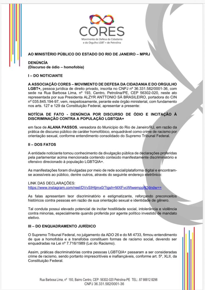 A OSC CORES – Movimento de Defesa da Cidadania e do Orgulho LGBT+ protocolou uma denúncia formal junto ao Ministério Público do Estado do Rio de Janeiro (MPRJ) solicitando a apuração de declarações de caráter homofóbico atribuídas à vereadora Alana Passos.