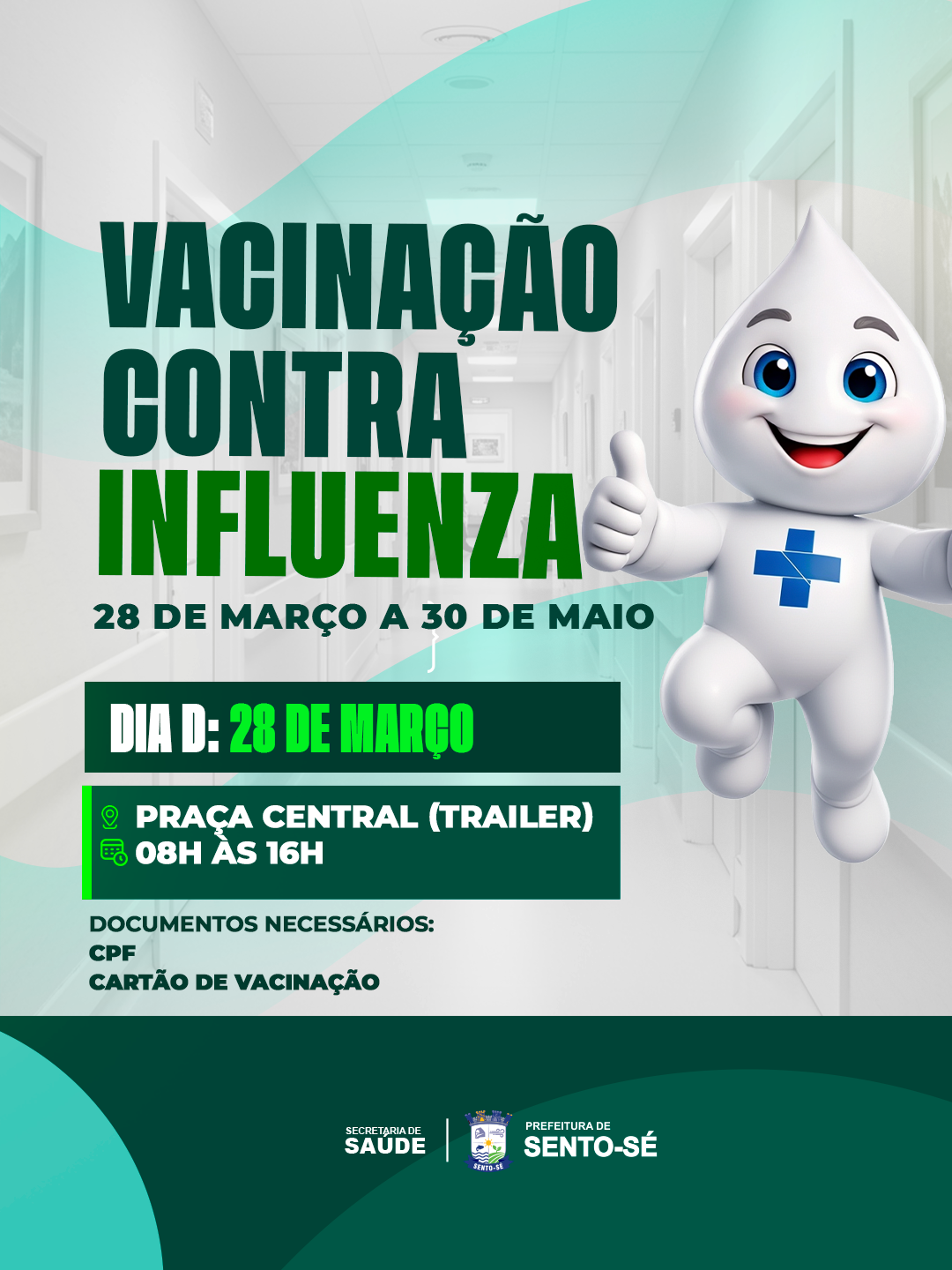 A Prefeitura de Sento-Sé, por meio da Secretaria Municipal de Saúde, inicia neste sábado (28) a Campanha Nacional de Vacinação contra a Influenza (gripe). A mobilização segue até o dia 30 de maio e começa com o Dia D, que será realizado das 8h às 16h, no ponto de vacinação da Praça Central.