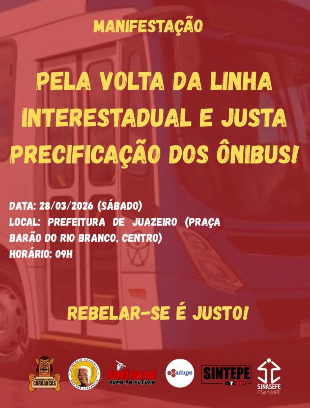 Acontece neste sábado (28), a manifestação de estudantes que dependem do transporte coletivo para cobrar a retomada da linha interestadual entre os municípios de Juazeiro, na região Norte da Bahia, e Petrolina, no sertão pernambucano. O ato está sendo organizado pelo Diretório Acadêmico da Universidade de Pernambuco (UPE).