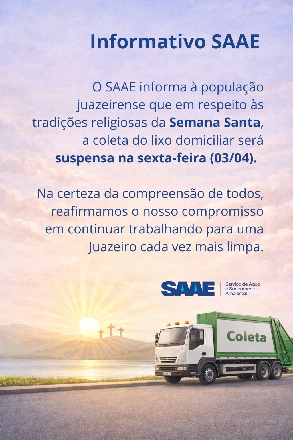 A coleta de lixo domiciliar será suspensa na próxima sexta-feira (03), em Juazeiro, no norte da Bahia, em razão das tradições religiosas da Semana Santa. A informação foi divulgada pelo Serviço de Água e Saneamento Ambiental (SAAE), responsável pelos serviços de limpeza urbana no município.