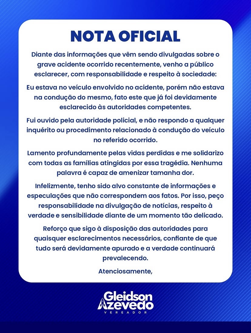 O vereador Gleidson Azevedo se pronunciou publicamente nesta quinta-feira (2) sobre o grave acidente ocorrido na última sexta-feira (27), na BR-324, entre os municípios de Nova Fátima e Gavião, que resultou na morte de cinco jovens. Em nota, o parlamentar negou que estivesse na condução do veículo.