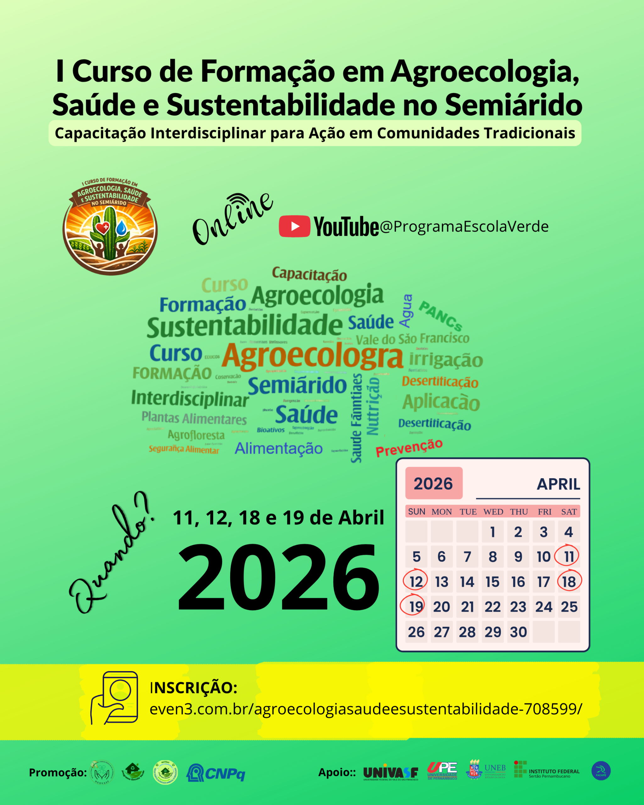 Contribuir para a qualificação de estudantes, profissionais e integrantes de comunidades tradicionais, a partir de uma abordagem interdisciplinar que integra agroecologia, saúde coletiva e sustentabilidade. Este é o objetivo do I Curso de Formação em Agroecologia, Saúde e Sustentabilidade no Semiárido, promovido pela Universidade Federal do Vale do São Francisco (Univasf), por meio do Programa Escola Verde (PEV) e do Núcleo de Estudos em Agroecologia do Vale do São Francisco (Neovasf). A formação será realizada nos dias 11, 12, 18 e 19 de abril, com atividades on-line e práticas. O curso é gratuito e aberto ao público, sendo voltado para estudantes, docentes, técnicos, agricultores, lideranças de comunidades quilombolas e indígenas e demais interessados na temática.