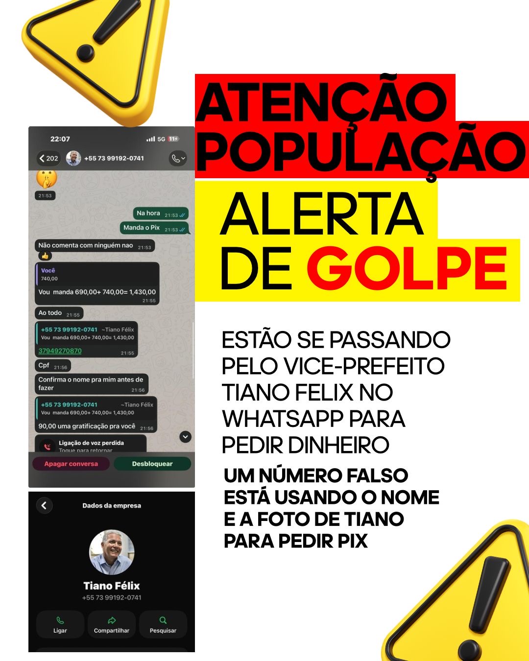 A assessoria comunica que o vice-prefeito não solicita dinheiro, doações ou qualquer tipo de contribuição financeira por meio de aplicativos de mensagem ou redes sociais. Em caso de contato suspeito, a orientação é não responder, não compartilhar dados pessoais e não efetuar pagamentos. A população também pode denunciar o número às autoridades competentes e aos canais oficiais.