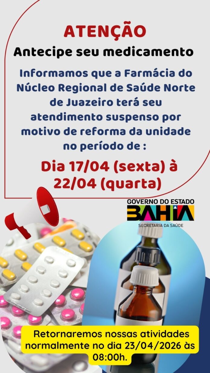 A Farmácia do Núcleo Regional de Saúde Norte, antiga 15ª DIRES, em Juazeiro, no norte da Bahia, terá o atendimento suspenso temporariamente a partir da quinta-feira (17) e segue até o dia 22 de abril. De acordo com comunicado, não haverá entrega de medicamentos, pois a farmácia estará em obra de reforma.
