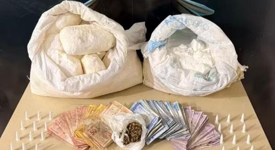 Após investigação, os policiais apreenderam em um imóvel mais de 11 kg de cocaína em barra, 31 pinos com cocaína, 6 kg de cafeína, sete comprimidos de ecstasy, uma porção de maconha, além de R$ 2.409 em espécie.