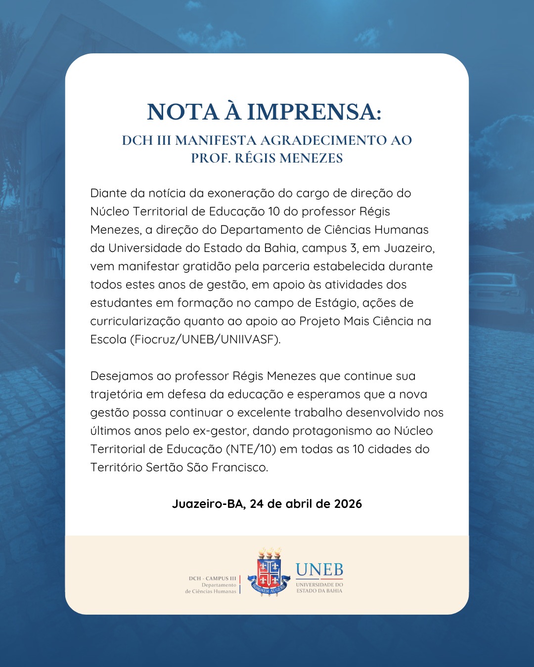 Diante da notícia da exoneração do cargo de direção do Núcleo Territorial de Educação 10 do professor Régis Menezes, a direção do Departamento de Ciências Humanas da Universidade do Estado da Bahia, campus 3, em Juazeiro, vem manifestar gratidão pela parceria estabelecida durante todos estes anos de gestão, em apoio às atividades dos estudantes em formação no campo de Estágio, ações de curricularização quanto ao apoio ao Projeto Mais Ciência na Escola (Fiocruz/UNEB/UNIIVASF).