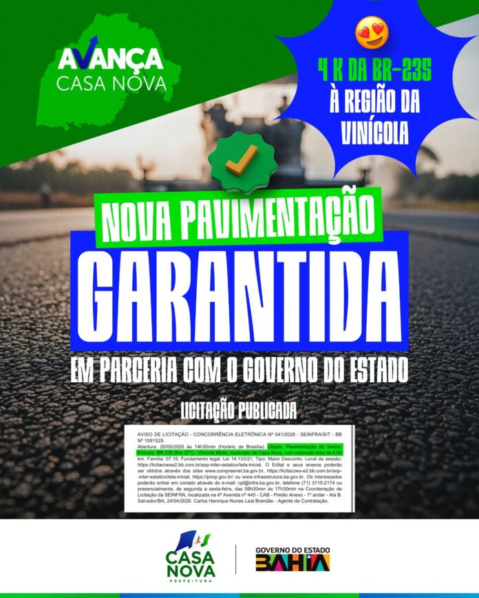 Mais uma importante conquista chega para fortalecer o desenvolvimento de Casa Nova. A gestão do prefeito Anisio Viana celebra a abertura do processo licitatório para a pavimentação de um trecho estratégico que liga a BR-235 (Km 371) à região da Vinícola Miolo, com cerca de 4 quilômetros de extensão.