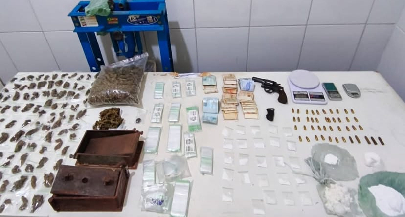 Os agentes localizaram diversos materiais ilícitos, entre eles substâncias análogas à maconha, cocaína e haxixe. Também foram apreendidos um revólver calibre .38, munições de diferentes calibres (.380, .38 e .32), balanças de precisão, embalagens do tipo zip lock e prensas hidráulicas.