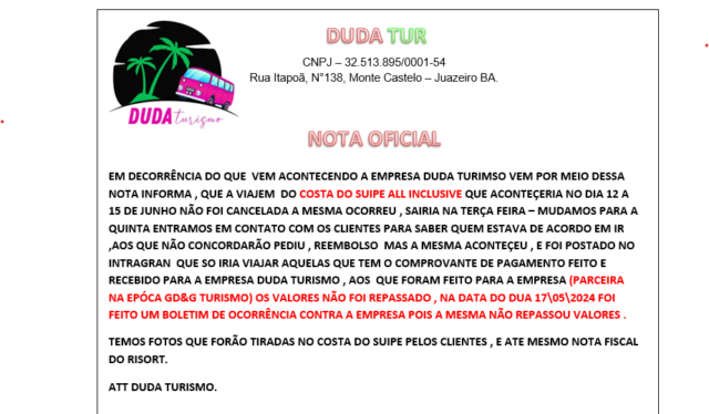 EM DECORRÊNCIA DO QUE VEM ACONTECENDO A EMPRESA DUDA TURISMO VEM POR MEIO DESSA NOTA INFORMAR QUE A VIAGEM DO COSTA DO SAUIPE ALL INCLUSIVE, QUE ACONTECERIA NO DIA 12 A 15 DE JUNHO, NÃO FOI CANCELADA. A MESMA OCORREU, SAIRIA NA TERÇA FEIRA – MUDAMOS PARA A QUINTA E ENTRAMOS EM CONTATO COM OS CLIENTES PARA SABER QUEM ESTAVA DE ACORDO EM IR. OS QUE NÃO CONCORDARAM PEDIRAM REEMBOLSO, MAS A MESMA ACONTECEU E FOI POSTADO NO INSTRAGRAM QUE SÓ IRIAM VIAJAR AQUELAS QUE TÊM O COMPROVANTE DE PAGAMENTO FEITO E RECEBIDO PARA A EMPRESA DUDA TURISMO.