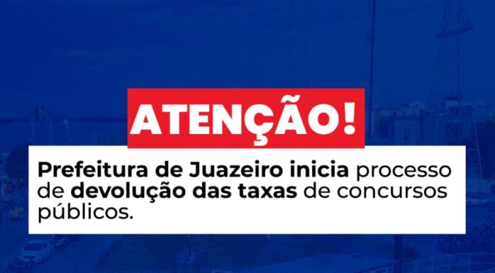 A Prefeitura de Juazeiro, em cumprimento ao acordo firmado com o Ministério Público do Estado da Bahia, MP-BA, com o Instituto de Desenvolvimento Institucional Brasileiro/IDIB e com o Serviço de Água e Saneamento Ambiental/SAAE, dará início, a partir desta quinta-feira (15), ao processo de devolução das taxas de inscrição referentes aos concursos públicos municipais regidos pelos editais nº 001/2024,...